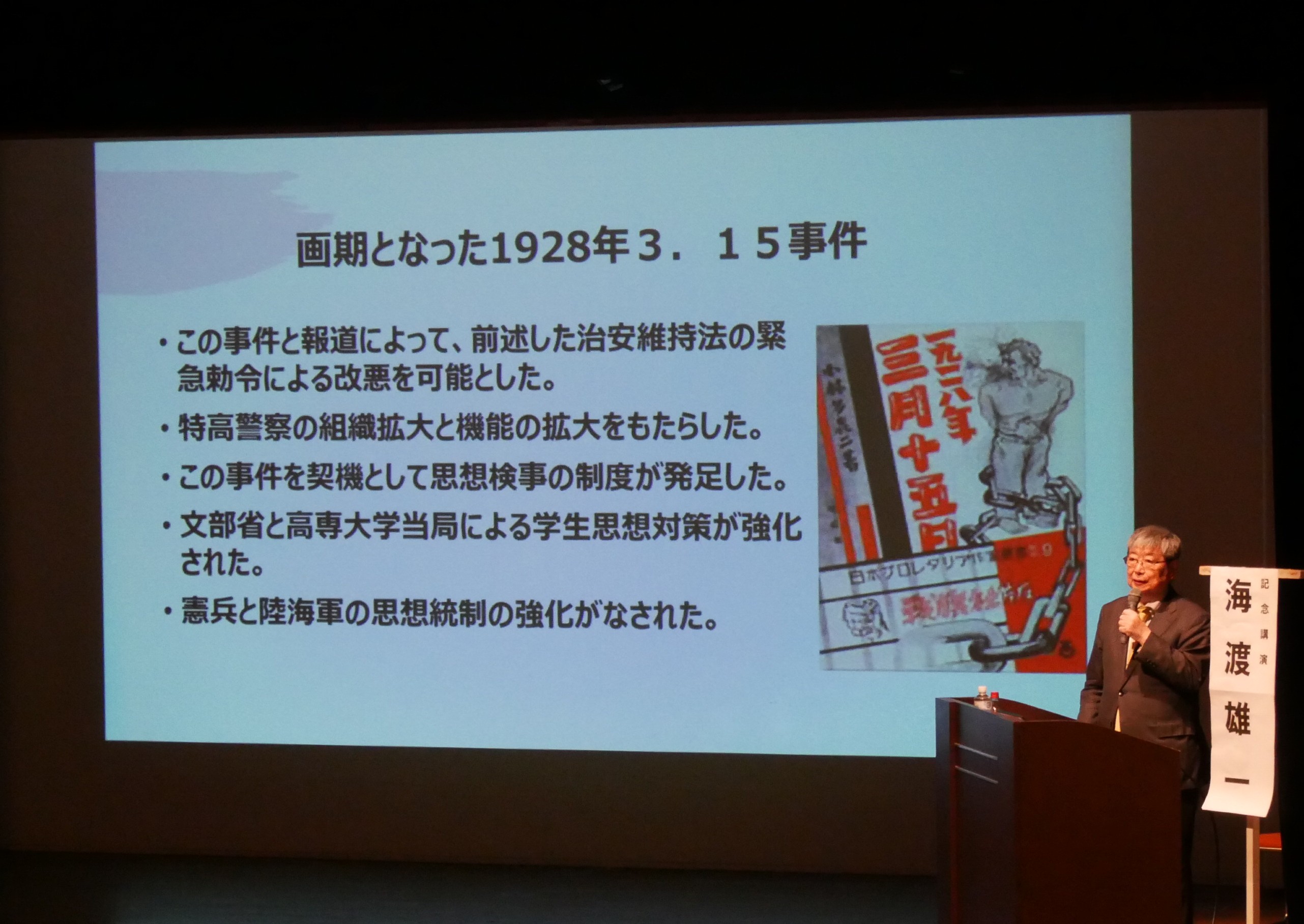 治安維持法は25年に成立して、28年に緊急勅令で目的遂行材と死刑が導入される。これによって一気に拡大することになります。そして1934年、5年にまたさらに改正しようとするんですが、それはできなかったんですけれども。この辺りから共産党の外殻組織を直接取り締まるようになっていきます。で、1941年にさらに改正されて刑期が引き上げられて死刑対象が拡大する。支援や準備結社の処罰もされるようになる。それまで予審判事がやっていたことを検事の権限とした。この改正が戦後にそのまま持ち越されることになりました。二審制で三審制じゃなくなってしまった。私選弁護士が禁止された国選弁護人にしか付けられない。まあ、そういうような制度になったわけです。で、ご存知と思いますが、1928年の3.15事件。これが日本共産党の組織を一網打尽にする、本当に大変な数の人が検挙されたというふうに言われています。そして、この大弾圧を契機にして、特高警察がどんどんどんどん組織拡大をして言ったこの日に行われたことをですね。ええ。本当にドキュメンタリーのように書いた本が、この小林多喜二の1928年3月15日で、この本を書いたことの報復として彼は虐殺されたというふうに言われています。あと、文部省高等専門学校当局によって学生思想対策が非常に強化されていく。まあだから教育の場において国体教育っていうんですけど、そういうものが強められていく。まあ今年の前半ずっとアンパンっていうドラマが。放映されておりましたけれども、中でのぶちゃんが愛国の鏡となってですね。すごい軍国少女になっていく過程があったと思うんですけれど、ああいうそのまさに一人ひとりの国民を国民としてですね、戦争の最前線に立たせるような表意、それが今もう日本でも始まってるんじゃないかなという感じがします。つい先だって僕、札幌に行ったんですけれども。そして北海道大学の中で学会があったんで行ったんですが、そこにですね、もう自衛隊が来てるんですよね。で、自衛隊の戦車のちっちゃなものとかも入ってきていて、そこに子供を呼び込んで、一緒にその制服着てて乗せてあげたりとか、そういうのしてるのみたいな、なんかちょっとぞっとしたというか、そういうことまでが始まってるんだなというふうに思いました。で、次にですね、共産党から周辺組織に範囲が広がっていきます。最初にねらわれたのは全協という労働組合。後、裁判官の中に共産党員がいるっていうことで、赤化判事事件っていうのが32年。それから長野における教員赤化事件と言われていて、これ、信濃毎日新聞をここに持ってきましたが、戦慄!教育赤化の全貌などという、おどろおどろしい信濃毎日新聞。今はとてもいい新聞になってますけれども、こういう扇情的なことをやっていた。1935年には、共産党の組織活動はほぼ終焉したというふうに言われています。で、1933年の小林多喜二さんの拷問による死亡。戦前でも拷問は禁止されていた。これ、やっちゃいけないことなんですけれども。ええ。そういうことがもう平然と行われていた。
